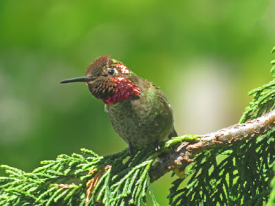 There are two hummingbird feeders on my deck. This little guy has decided one of them is his private feeding station. He spends time watching the feeder from a nearby tree. When another hummer arrives, he takes off like a jet to chase away the competition.